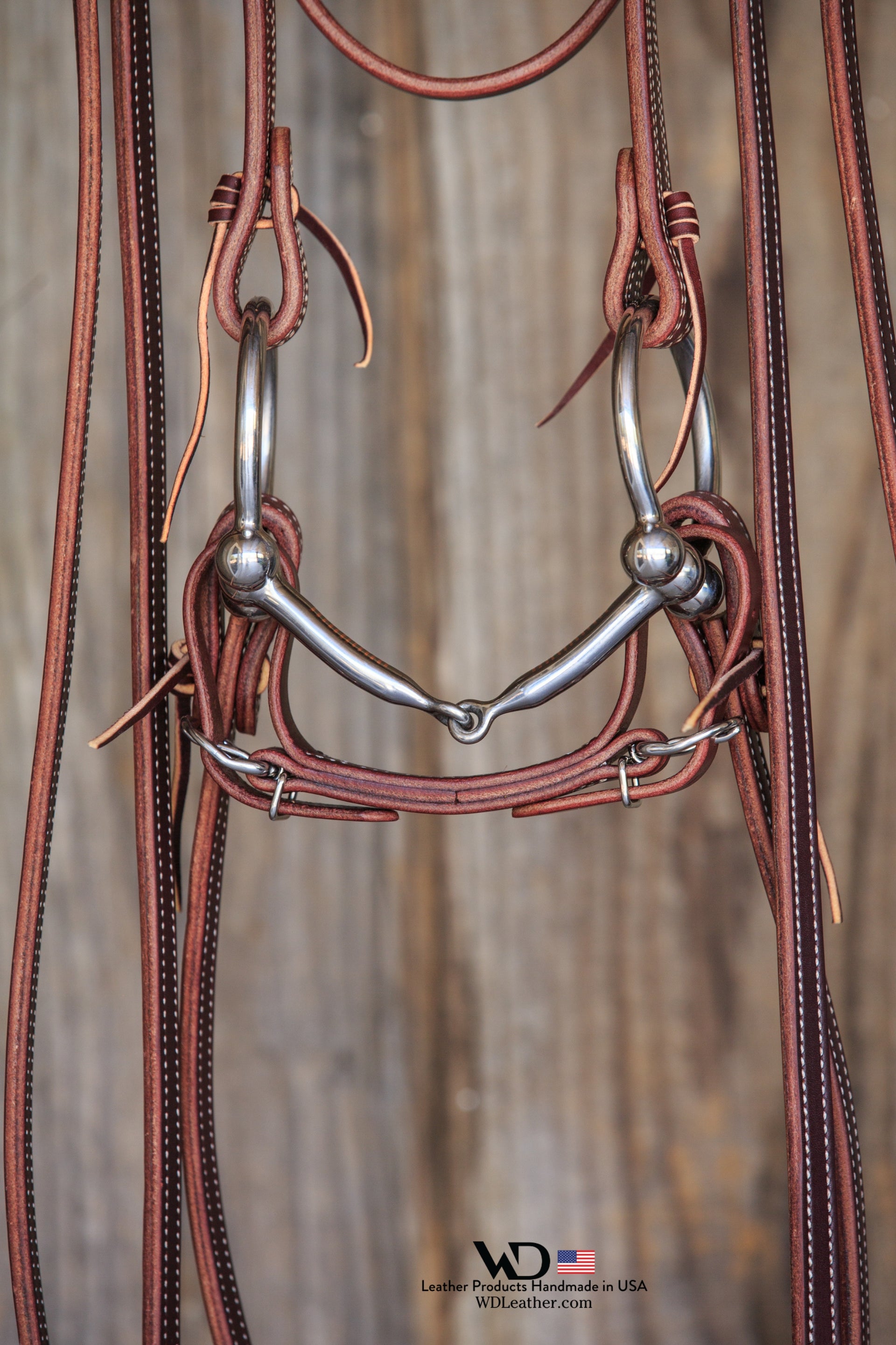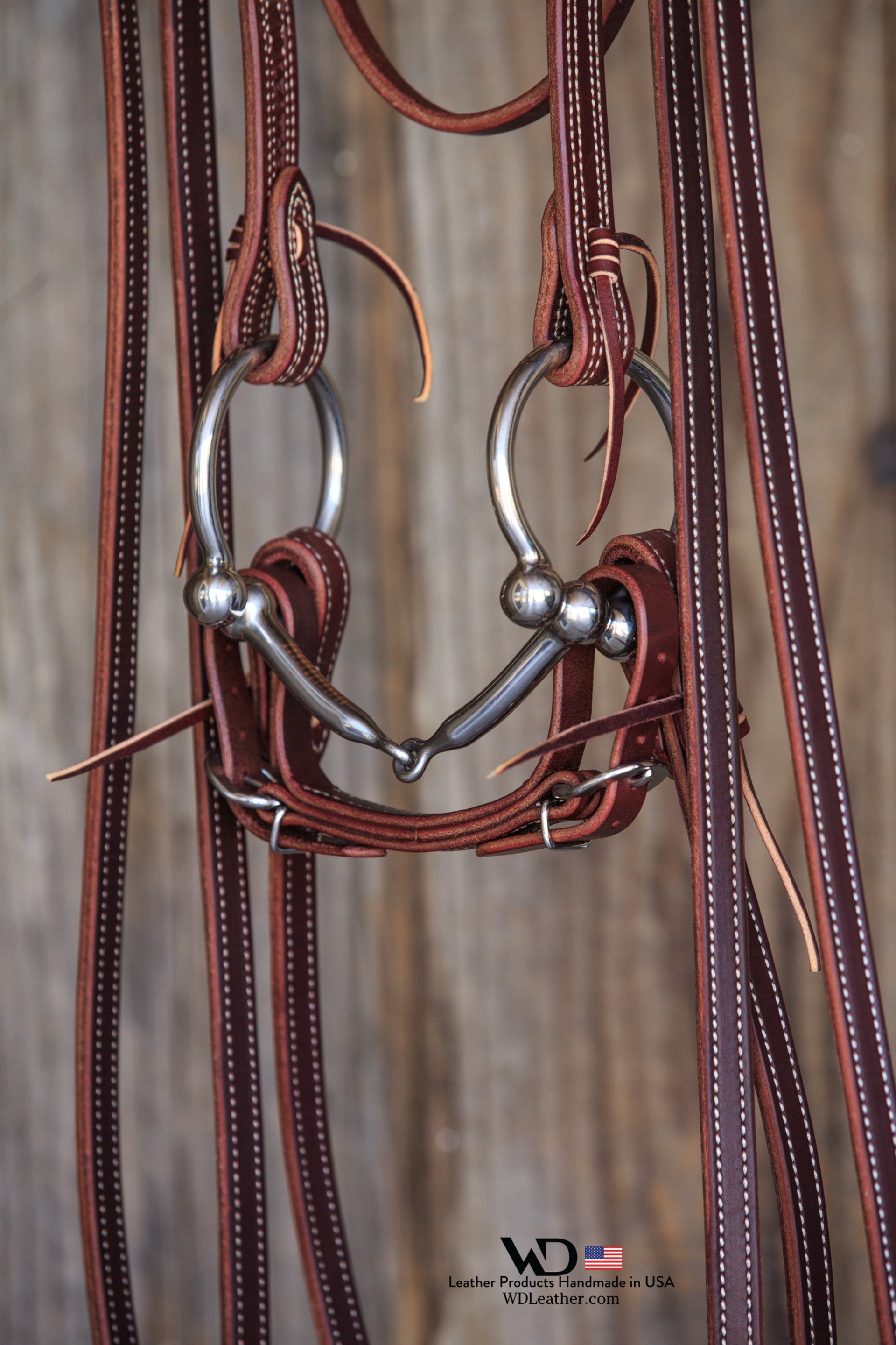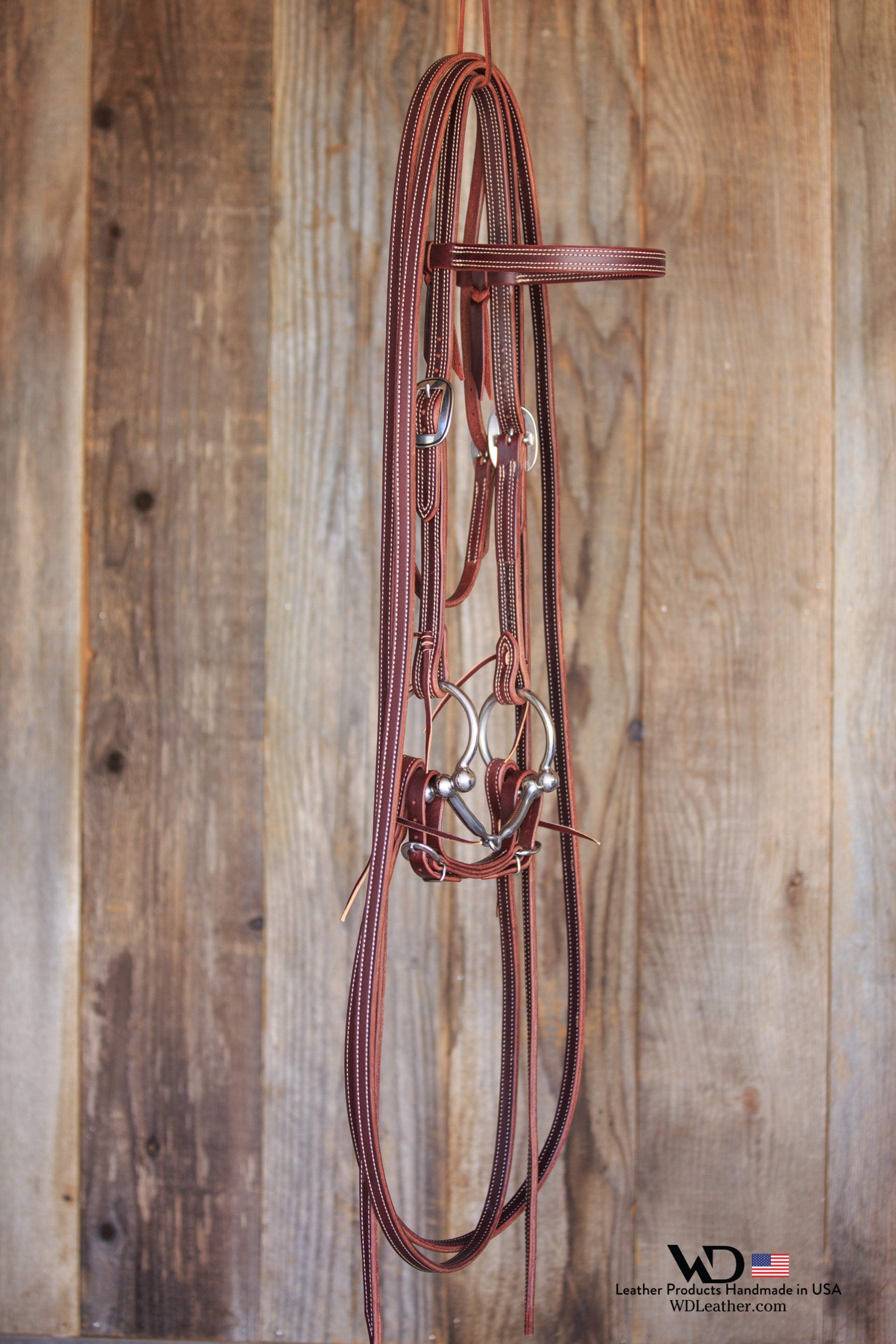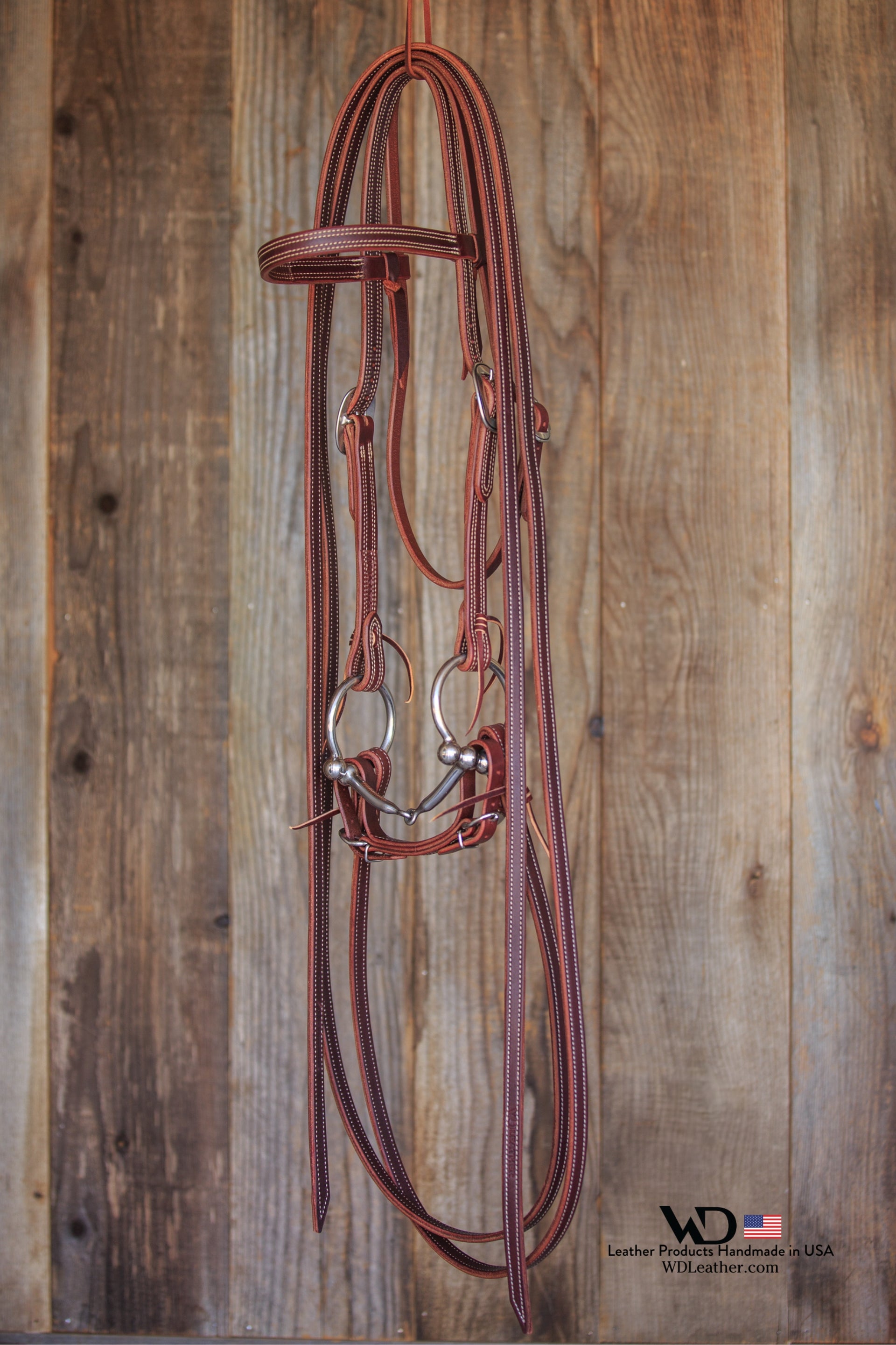 This bridle set includes our signature Premium Double & Stitched Latigo Browband Headstall and buttery soft Double & Stitched Latigo Reins, Latigo Curb, and D-Ring Smooth Snaffle Bit.